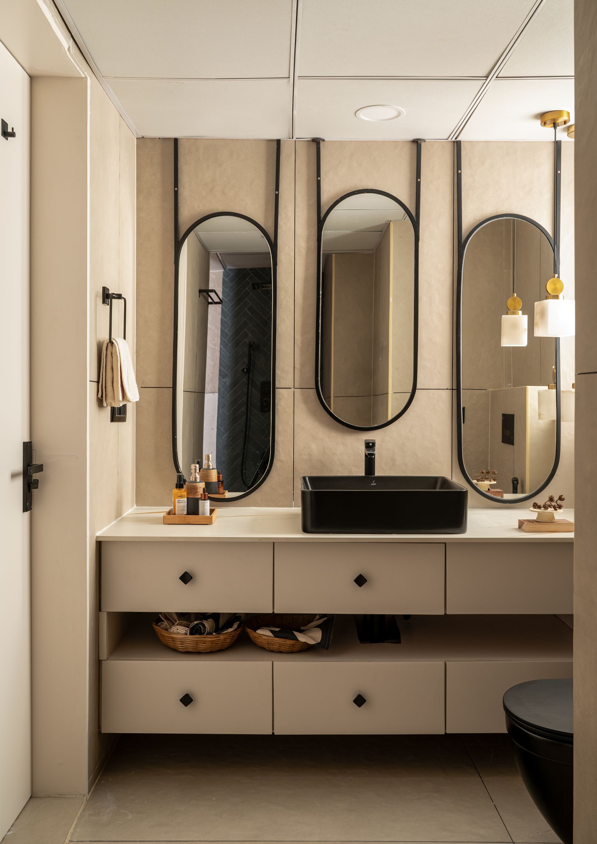 dives deep into the semblance of indulgence, anchored by a suave porcelain bathtub atop the speckled mosaic floors, tenderly lit by the globed chandelier above. A shower cubicle and capacious vanity elevate the benchmark of luxury, the latter enlarging the visual expanse and light with its trio of oblong mirrors forged in black metal to counterbalance the copious beige.