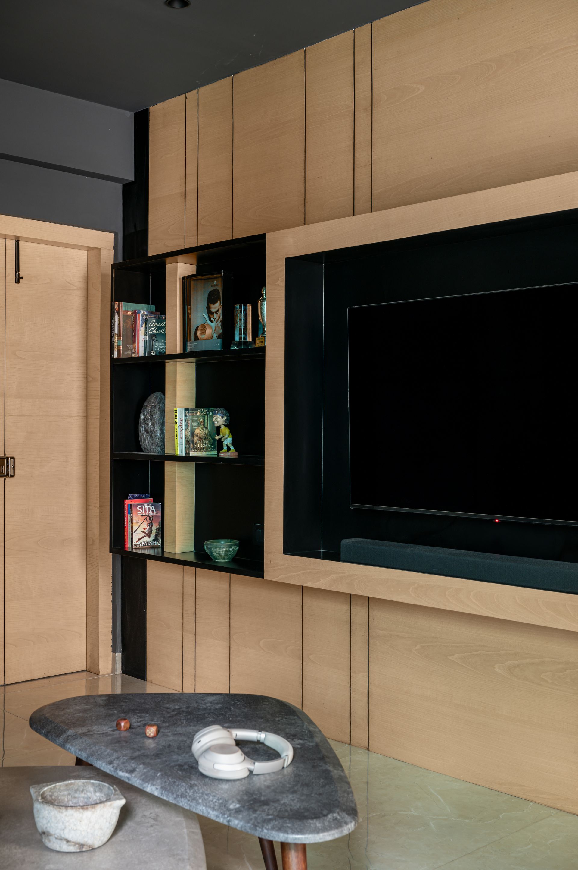 Steering one’s transition through the residence, the rear end of the passageway creates a moment of intentional pause. A bespoke clay wall installation by The Potter’s Place impersonates the fusion of artisanship and modernist inclinations. Crafted by a homegrown collective of sculptors, the installation showcases hand-moulded clay forms against a grainy wooden backdrop, enticing one to touch and feel finishes peppered throughout the apartment. This centrepiece is an impeccable segue into the couple’s retreat, the media room.