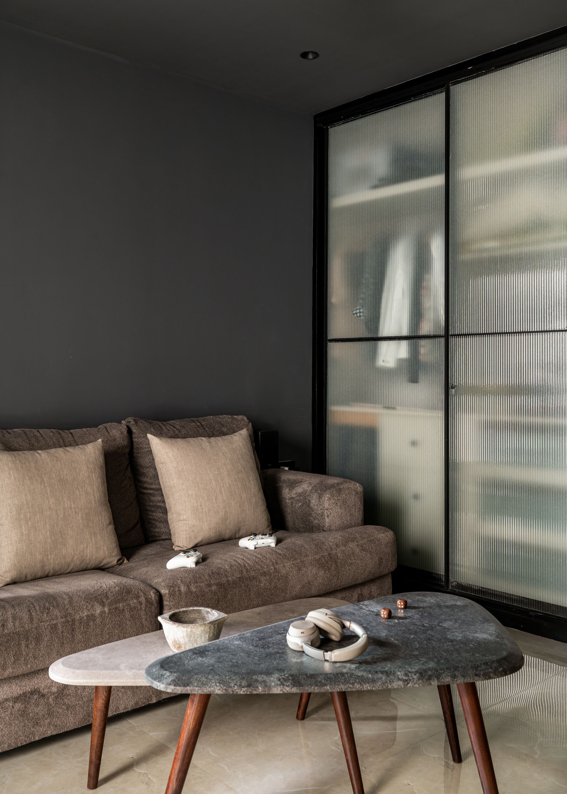 The imposing door to the media room is lofty, painted matte black, save for its crimson handles. Mystery and awe rent the air as a dark-toned palette cloaks the room’s interior. The walls are painted black, and the choice of light wood veneer draws on their distinctions to offer the residents a cinematic ambience wherein the materials put on a theatrical performance of their own!
