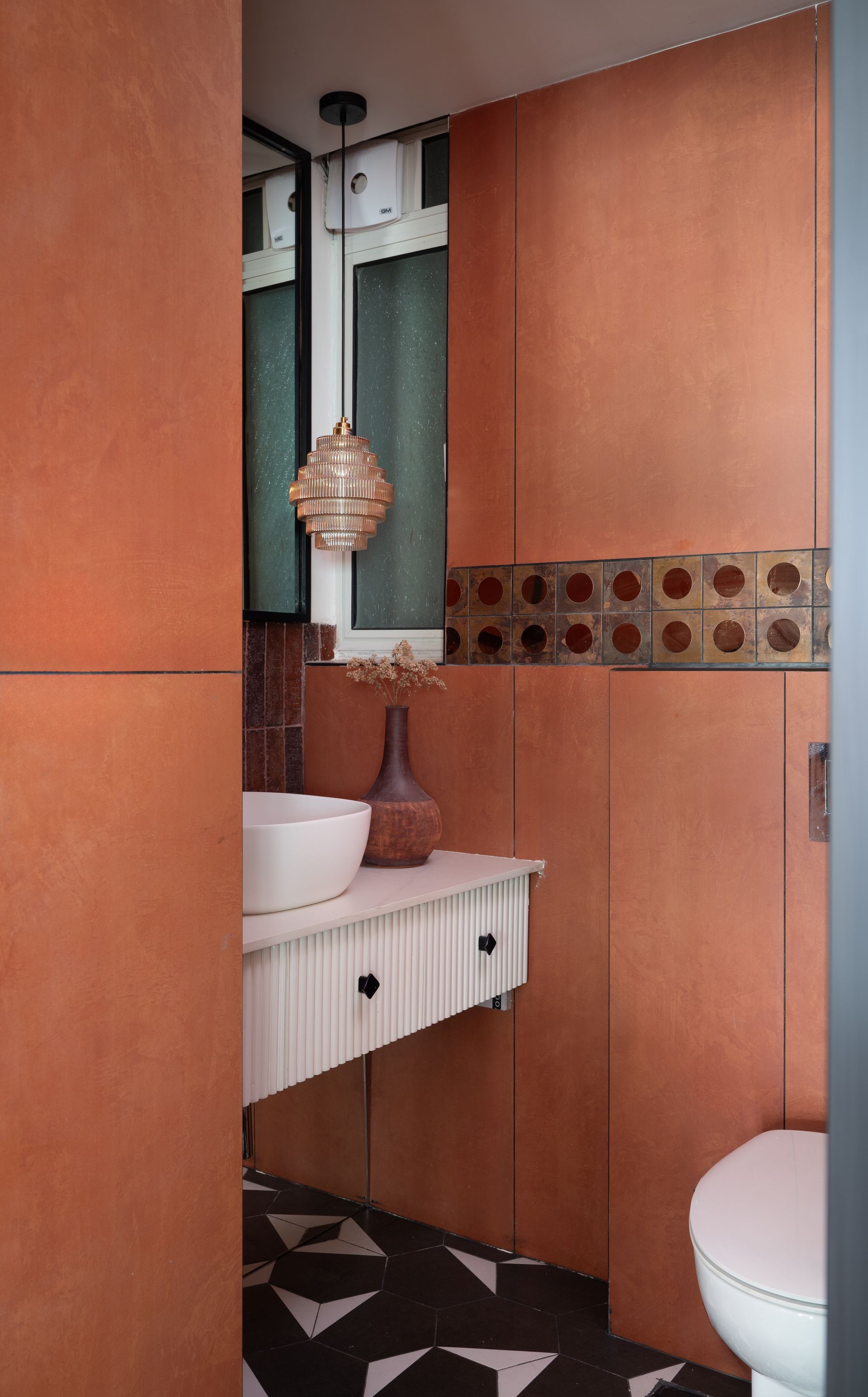Roosted behind a ribbed glass door off the foyer, the powder room is a petite slice of the blueprint, awash in a heady shade of earthen orange, offset by a sea of retro-geometric floor tiles in black and white. A band of circle-bearing sepia tiles line the wall, strengthening the warm palette while alluding to the shape’s recurrent presence throughout the residence.