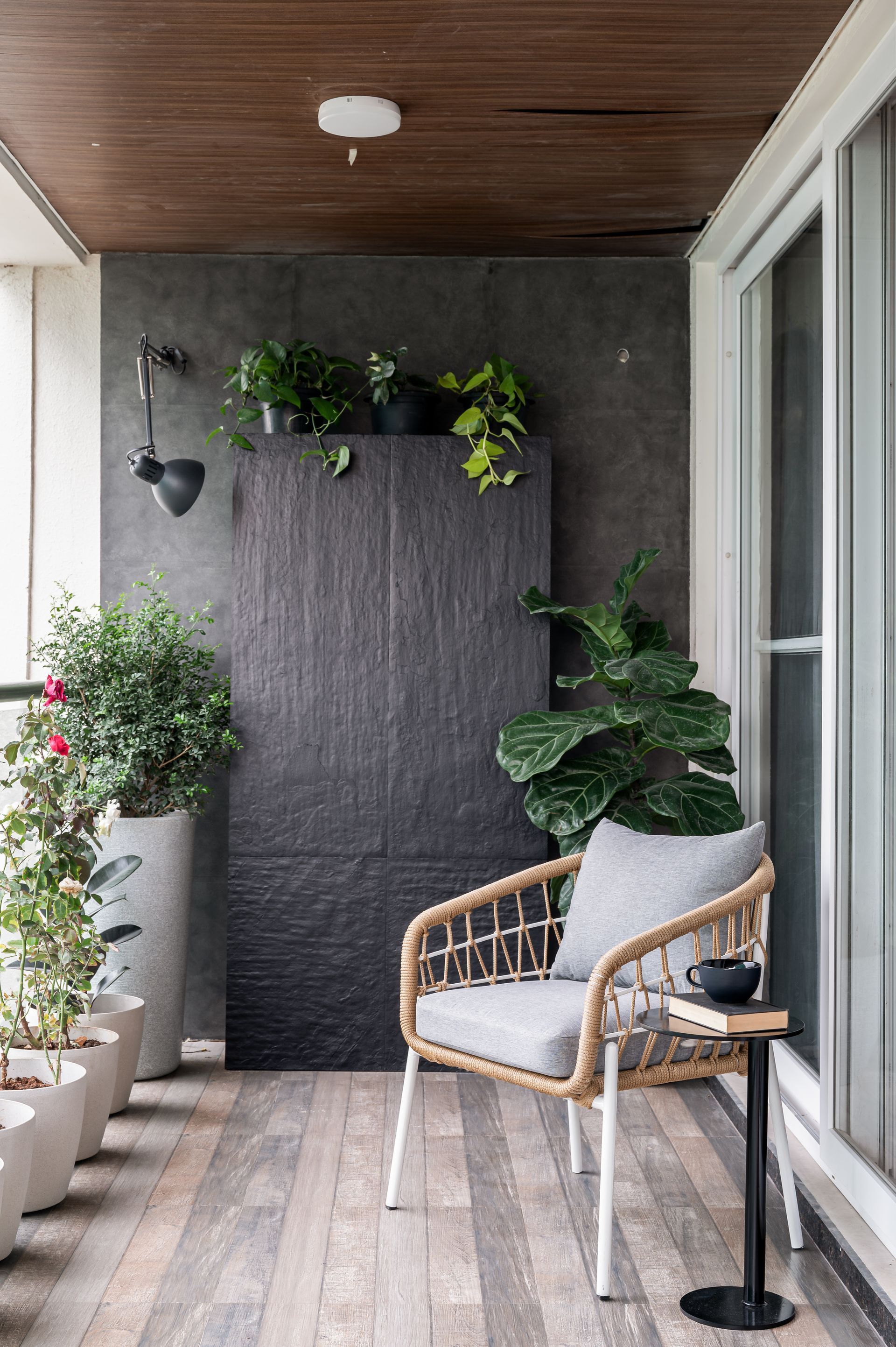 Delicately obscuring the membrane between the indoors and the outdoors, the balcony is an appendage to the open-plan living areas. Sunlight is sieved through the deep overhangs of the balcony, tingeing the inside in a gilded glow. The dark-toned wall finishes provide a backdrop for the greenery to vividly debut, fashioning the quintessential space to entertain or relish in solitude.