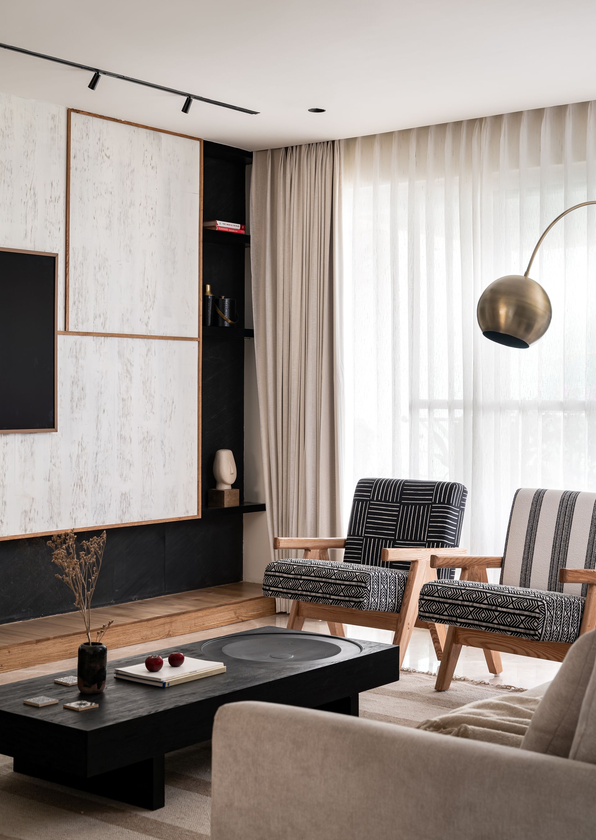 Swathed in hearty splashes of daylight, the living room is the home’s avowed oasis of calm. Drawing from contemporary-minimalism principles, neutral tones, wood accents, monochromes, and modest ornamentation headline the space. The bespoke furniture forms the conversation area, savouring clean lines and the purposeful intervention of bold, graphical prints in black and white. The black elm coffee table is the objet d’art, accentuating the rawness of the wood’s interlocked grains. This zone is assembled over the grand expanse of a beige and white textured rug handwoven by local artisans. The television wall has been imagined as a harmonious part of the space’s canvas. The wall is covered in a gritty stone texture, overlaid by stained wood beading that borrows its colour from the living area’s elements. The television is integrated into the wall, creating an uninterrupted spread. A culled-out niche carries oversized earthenware, injecting a medley of intentionally imperfect textures against the stark stretches of white.