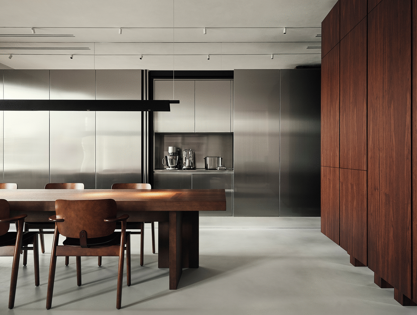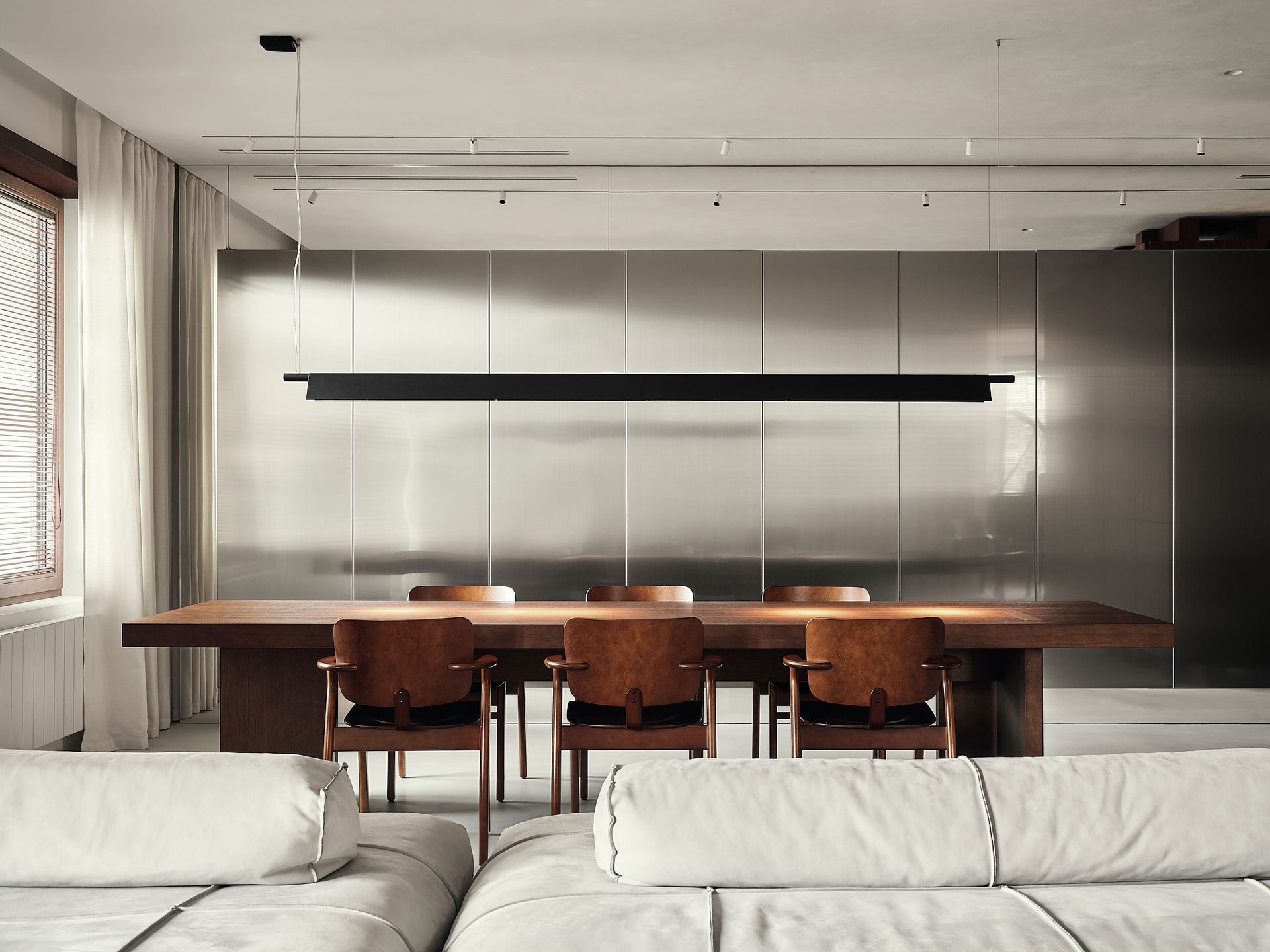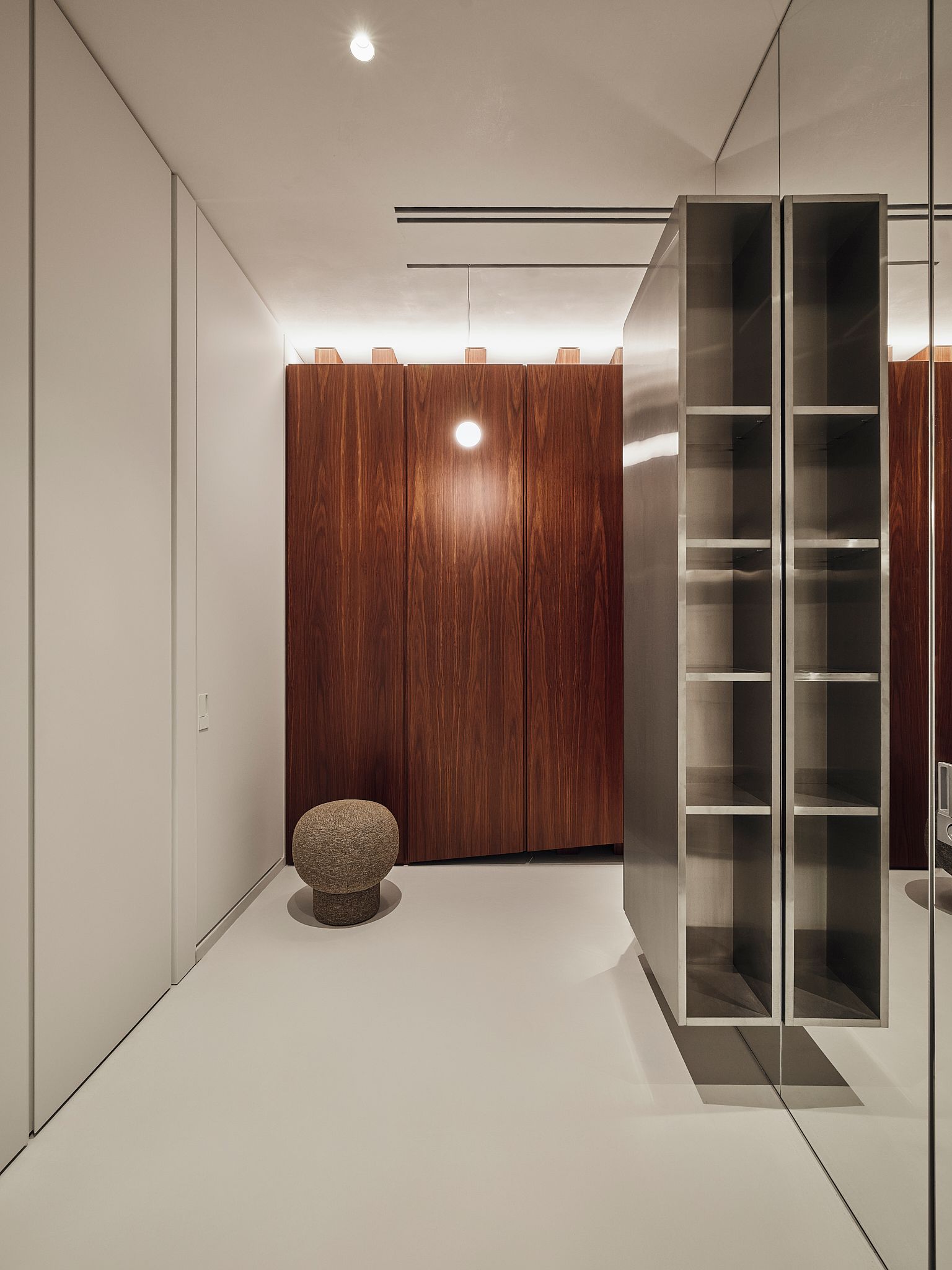 This interior project is a vivid example of modern eclecticism. It blends the intellectual atmosphere of St. Petersburg with contemporary volumes and accents: warm wood sits alongside a stainless-steel kitchen, while clean, laconic forms coexist with vintage and contemporary art. The space is animated by numerous art objects, including a minimalist family portrait painted by the studio and vibrant small-format artworks distributed throughout the apartment. More than just a residence, the project reflects the clients’ values and character, demonstrating how architecture can shape new life scenarios for a modern family.