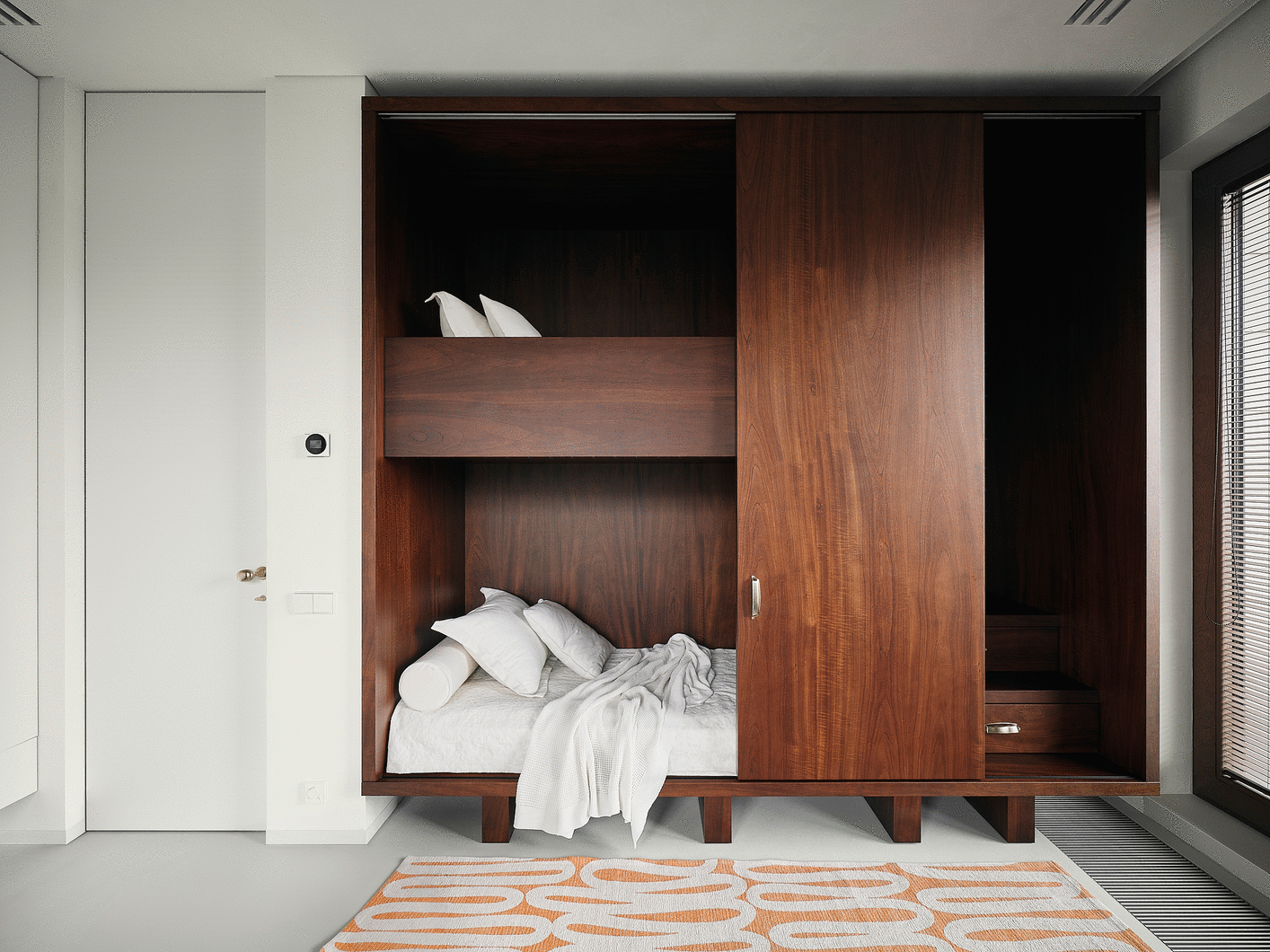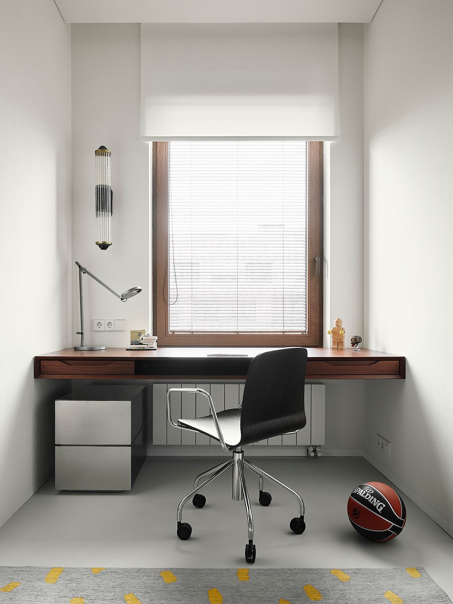 The space was designed to accommodate a wide range of functions, leading the studio to conceptually divide the apartment into two distinct areas. One part was dedicated to a spacious public zone, featuring a kitchen & living area intended for shared leisure activities, where the piano naturally found its rightful place. The second part houses the private functions, including bedrooms and bathrooms. As a result of this layout, a portion of the bay window became part of the common area, making it an ideal location for the head of the family’s workspace. When needed, this area can be visually separated from the kitchen&living room with curtains.