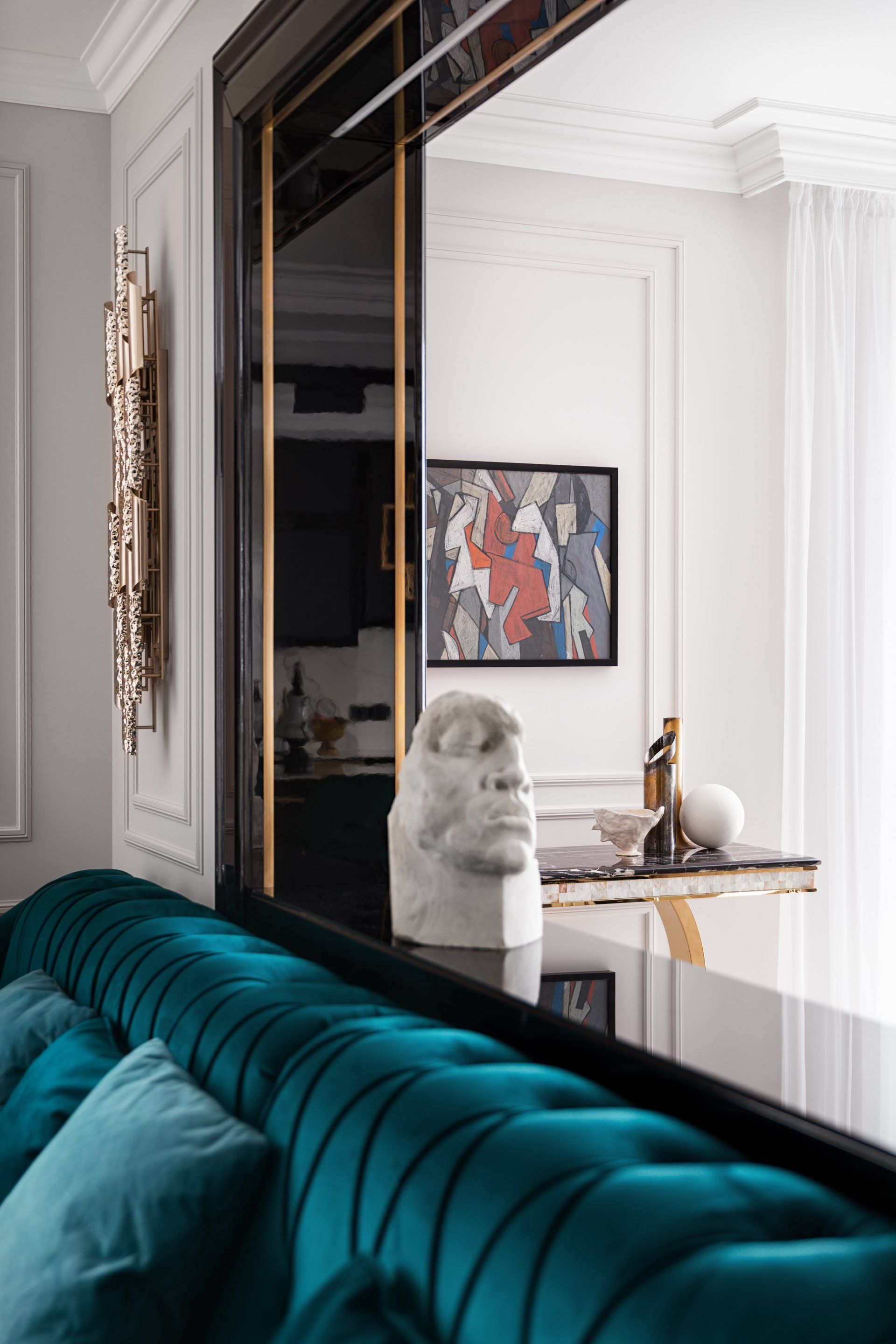 Entrance and living room are characterized by the combination of gloss brass, wood, noble stone, black gloss and saturated deep velvet that together made this space the embodiment of moderate luxury.