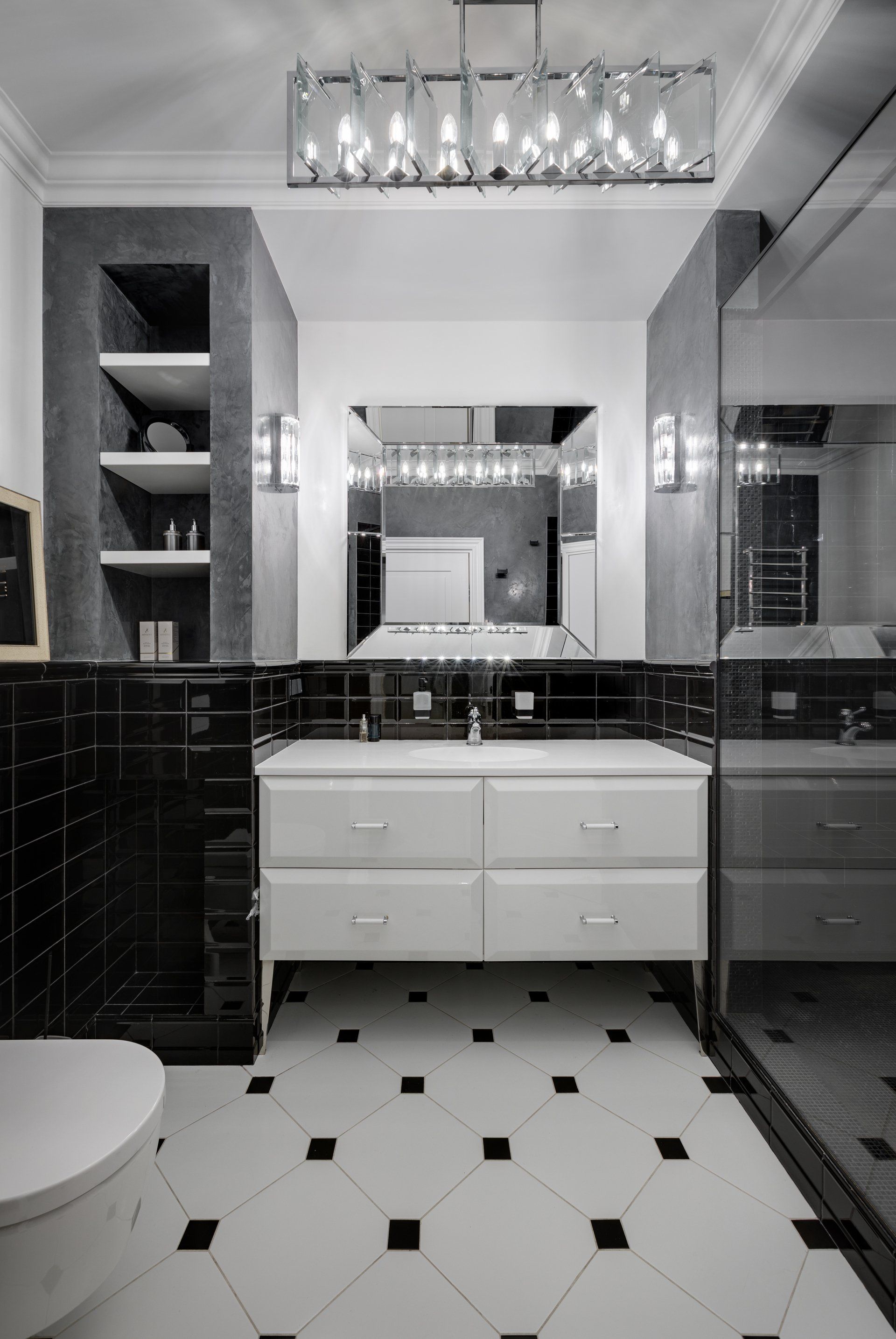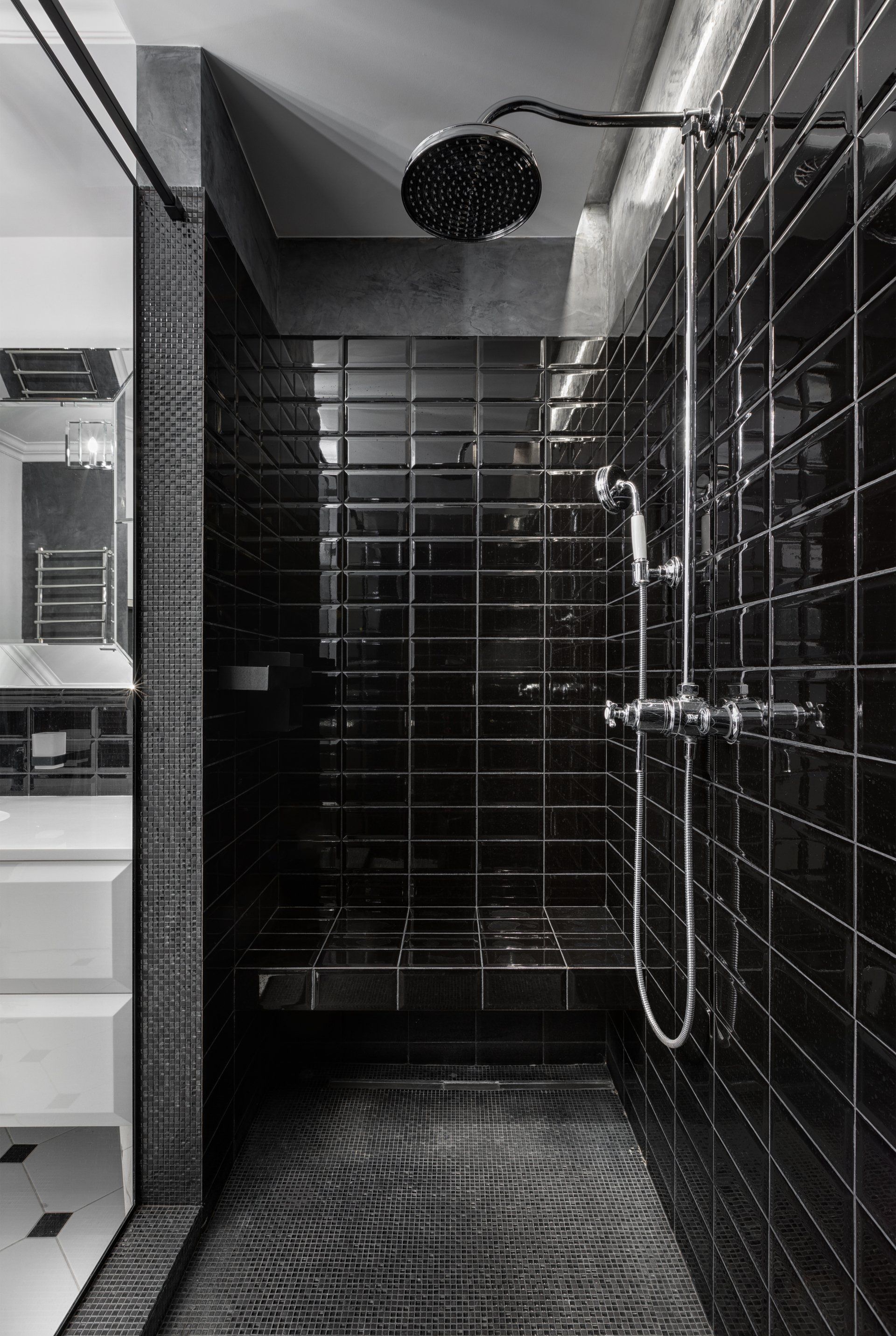 To collect all the necessary elements of tiles for the bathroom, the studio combined the collections of five factories, as the designer wanted to create a rhythmic ornament in the spirit of the American Art Deco.
