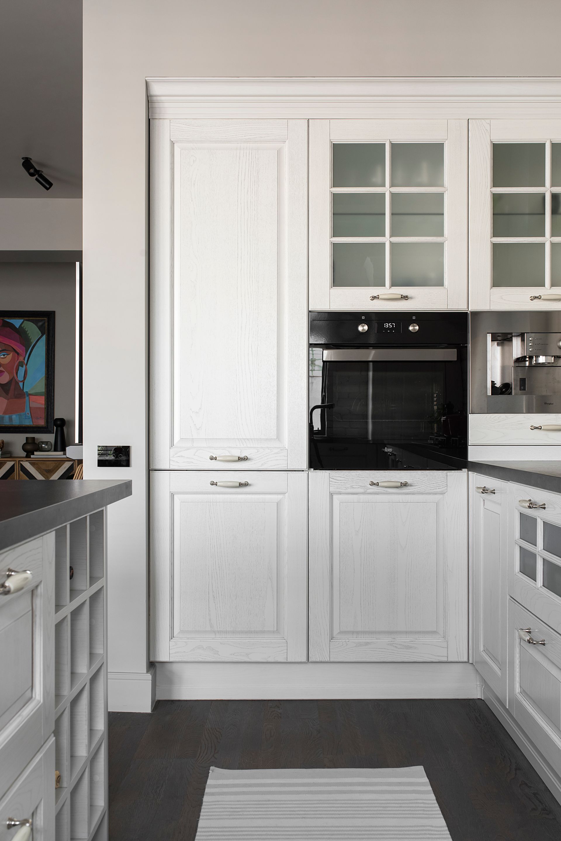 It was necessary to start with a change in layout. Initially, it was an apartment with a separate narrow kitchen, three separate rooms and one walk-through room as well as a fairly large area of meaningless corridors. So, in the process of remodelling, part of the apartment turned into an open space with a kitchen and a dining area, a separate walk-in dressing room and a TV zone with a bio-fireplace which creates a special atmosphere in the house.