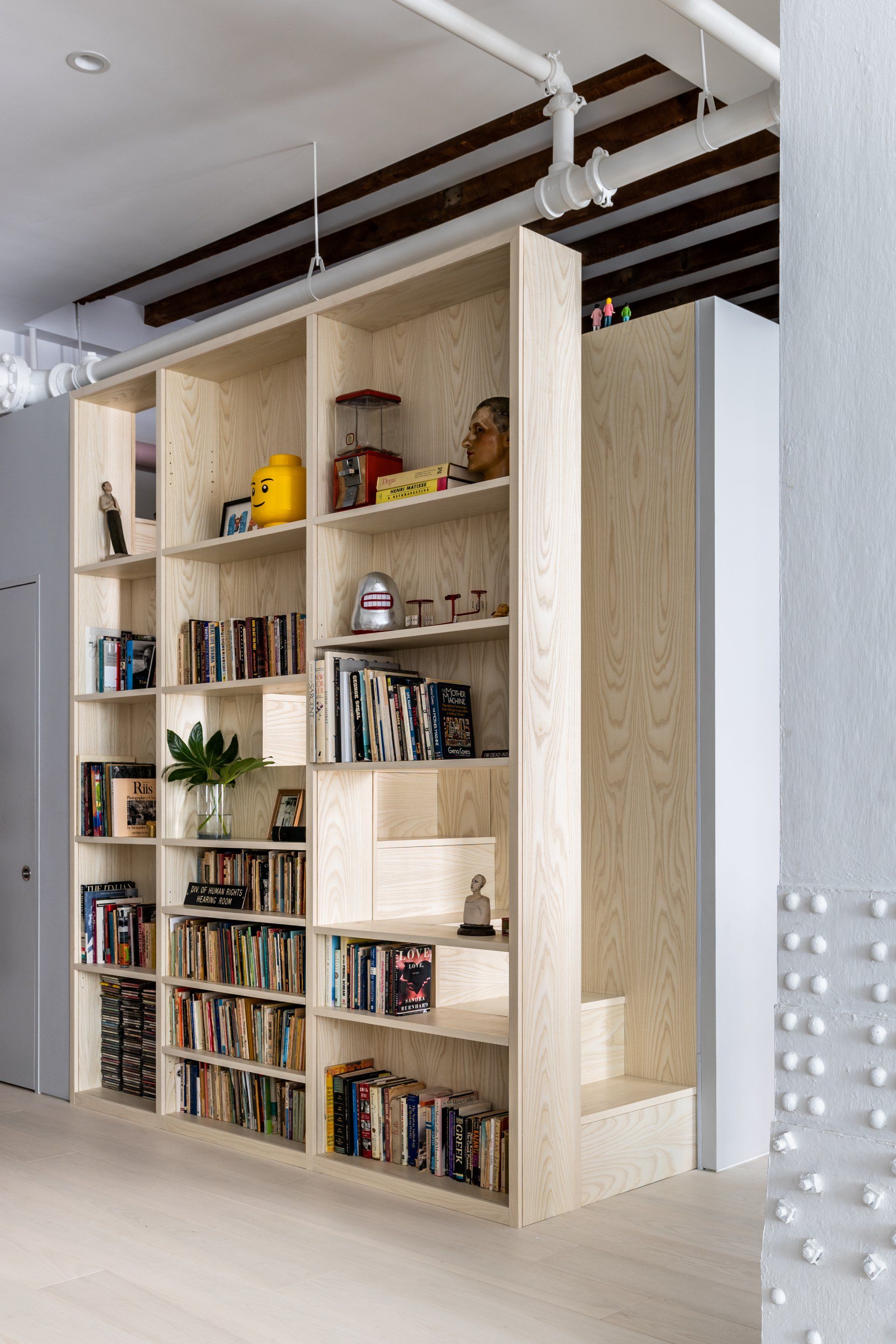 The gray lacquered entry foyer contains a closet, a concealed wet bar, and display niches. A semi-open ash wood bookcase extends to form a staircase leading to a guest sleeping loft above. The neutral, elegant case serves to highlight its contents: the couple’s eclectic collection of books, sculpture, and ephemera. Some objects point to their respective careers in law and acting and one of the owner's early studies as a painter; others embody their mutual interest in art history, vintage games, and theatre.