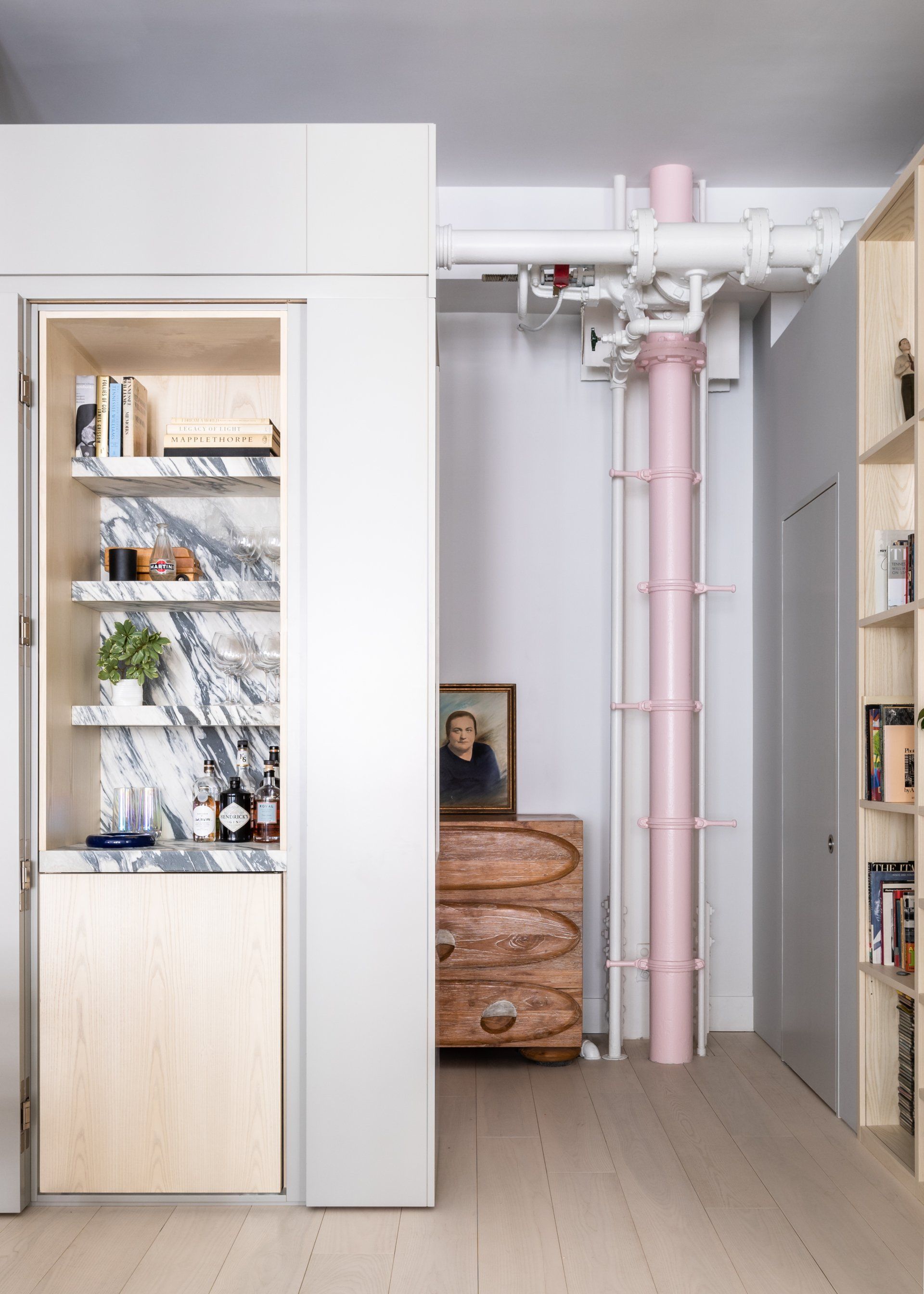 Hugging the living room wall, a long element of ash wood and richly patterned Calacatta Black marble integrates a desk, book storage, and a fireplace. The built-in lies low on the wall, leaving ample space above for a salon display of the couple’s vibrant art collection, including figurative paintings by Yue Minjun and George Segal, a portrait of the wife, and a graphic vintage poster for the 1965 Italian film Break Up, among many other works—some purchased from local artists and street vendors, some gifted from friends who are painters, and others which are family heirlooms. Tall windows that overlook Manhattan flood the desk and art wall with natural light.