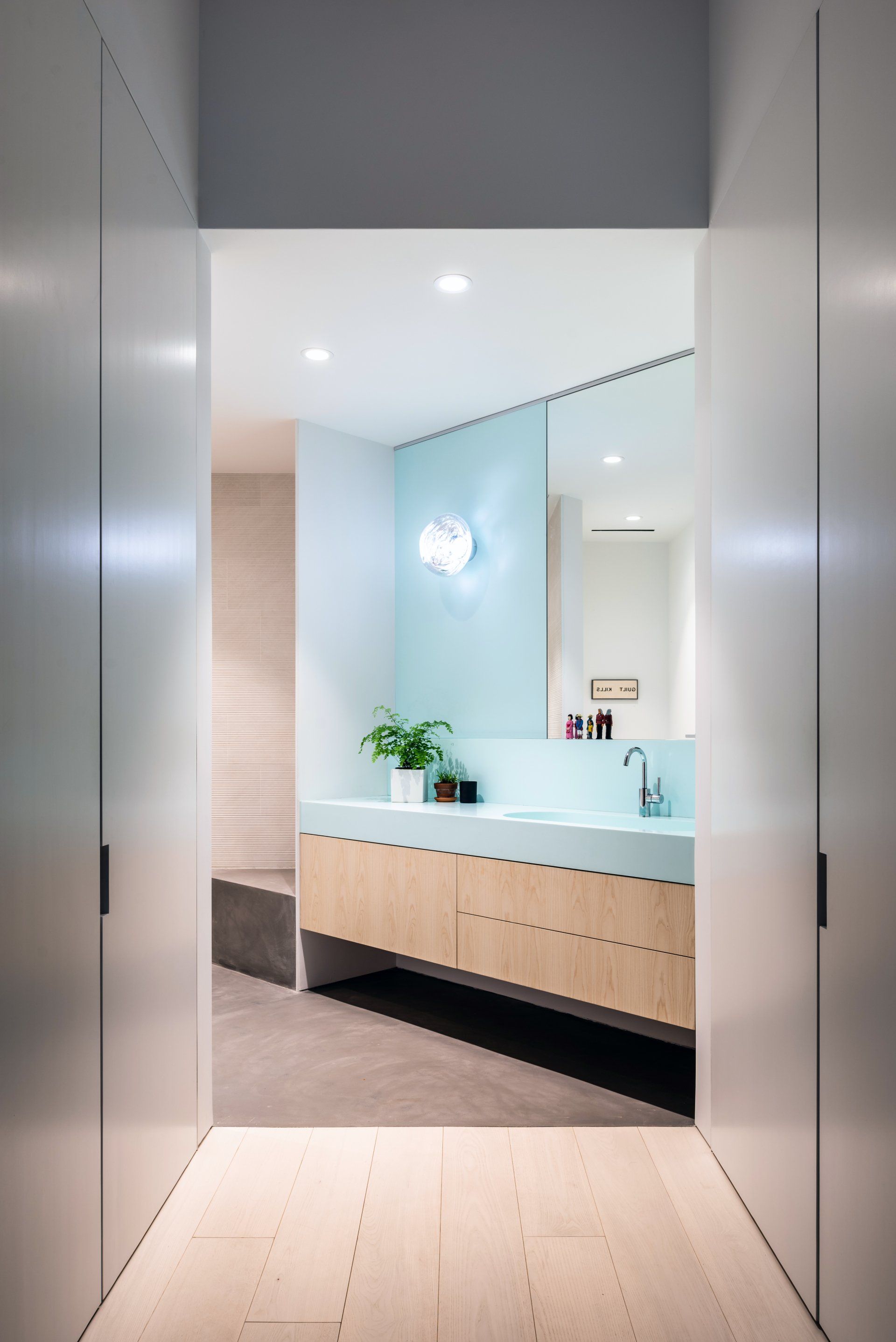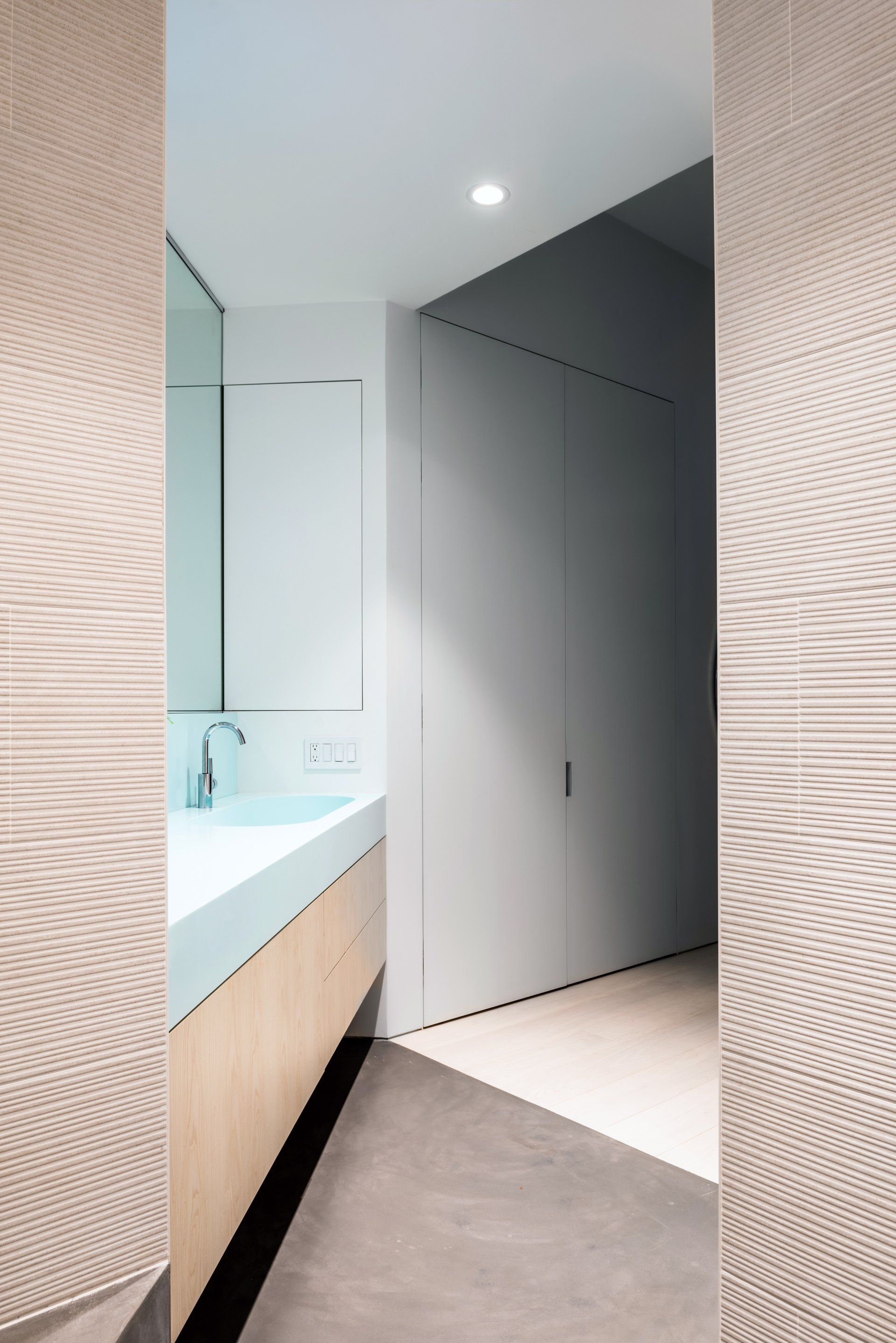 Throughout the apartment, white stained wide plank ash wood floors were used to brighten the space. Reclaimed wood doors previously salvaged in the loft, were re-salvaged and refurbished to create a deliberate historic insertion into the gray walls housing the guest bathroom and utility room. Complementing the salvaged wood doors, a graphic wall tile with a black-and-white wood-grain imprint clads one bathroom. The room is distinguished by bold patterns—the black-and-white floor porcelain tiles resemble terrazzo—and punctuated with pops of marigold yellow in the faucet and light fixture. The master bathroom is more muted, with a custom ash wood vanity and light blue resin vanity top against concrete floors and ecru, textured wall tiles with troweled striations.