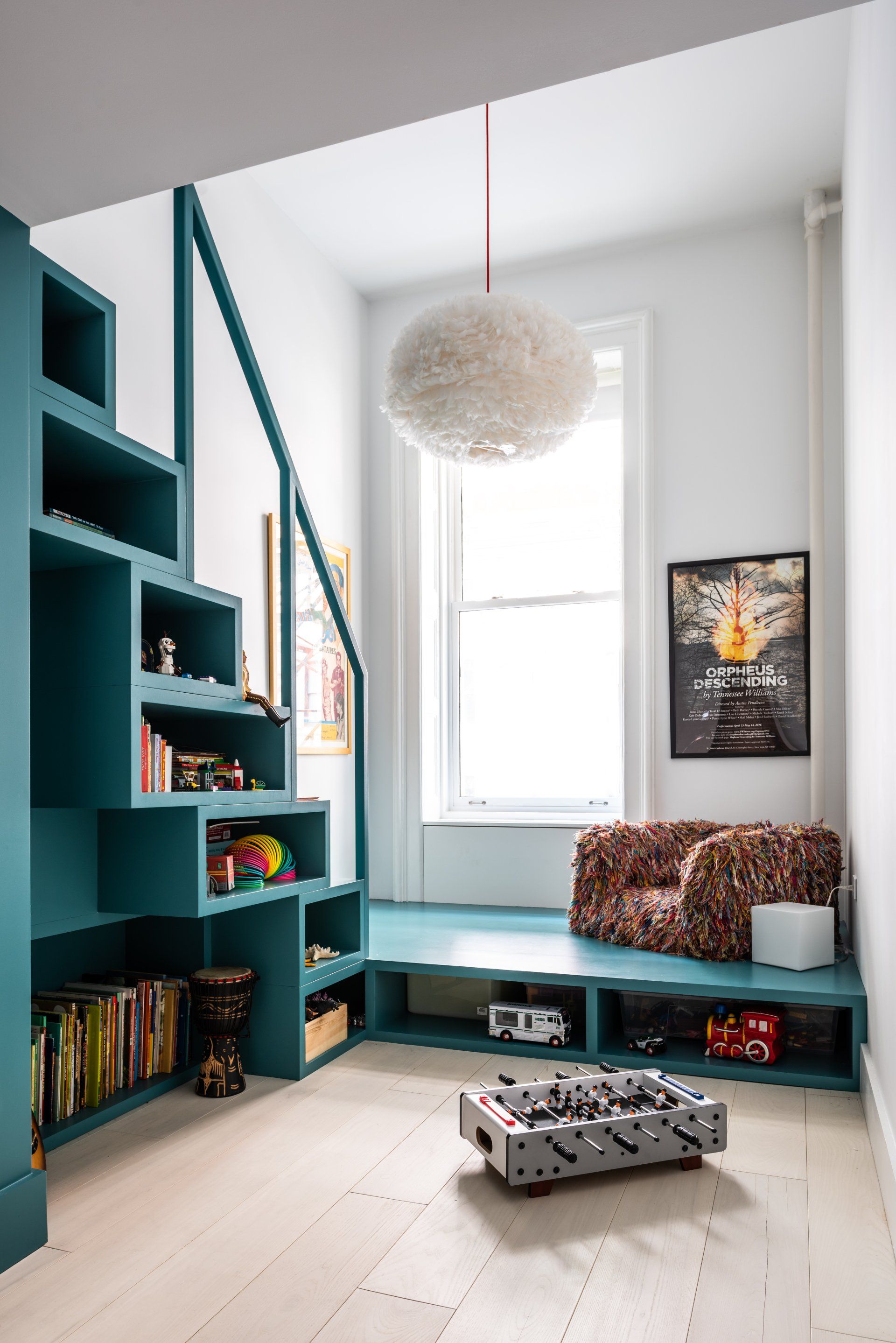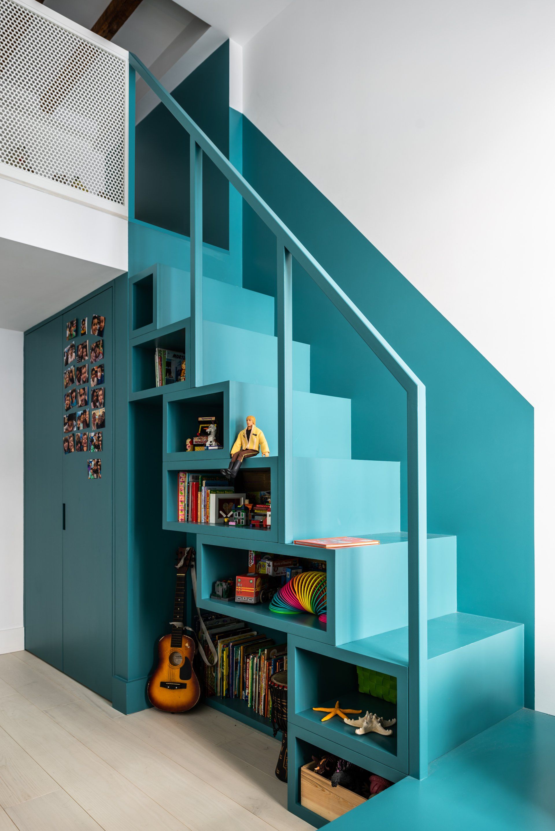 For the second bedroom, the organizing element is a deep turquoise staircase leading to a sleeping loft that doubles as a bookcase, storage, and play platform, providing a moment of vibrant color in the room that the child selected himself.