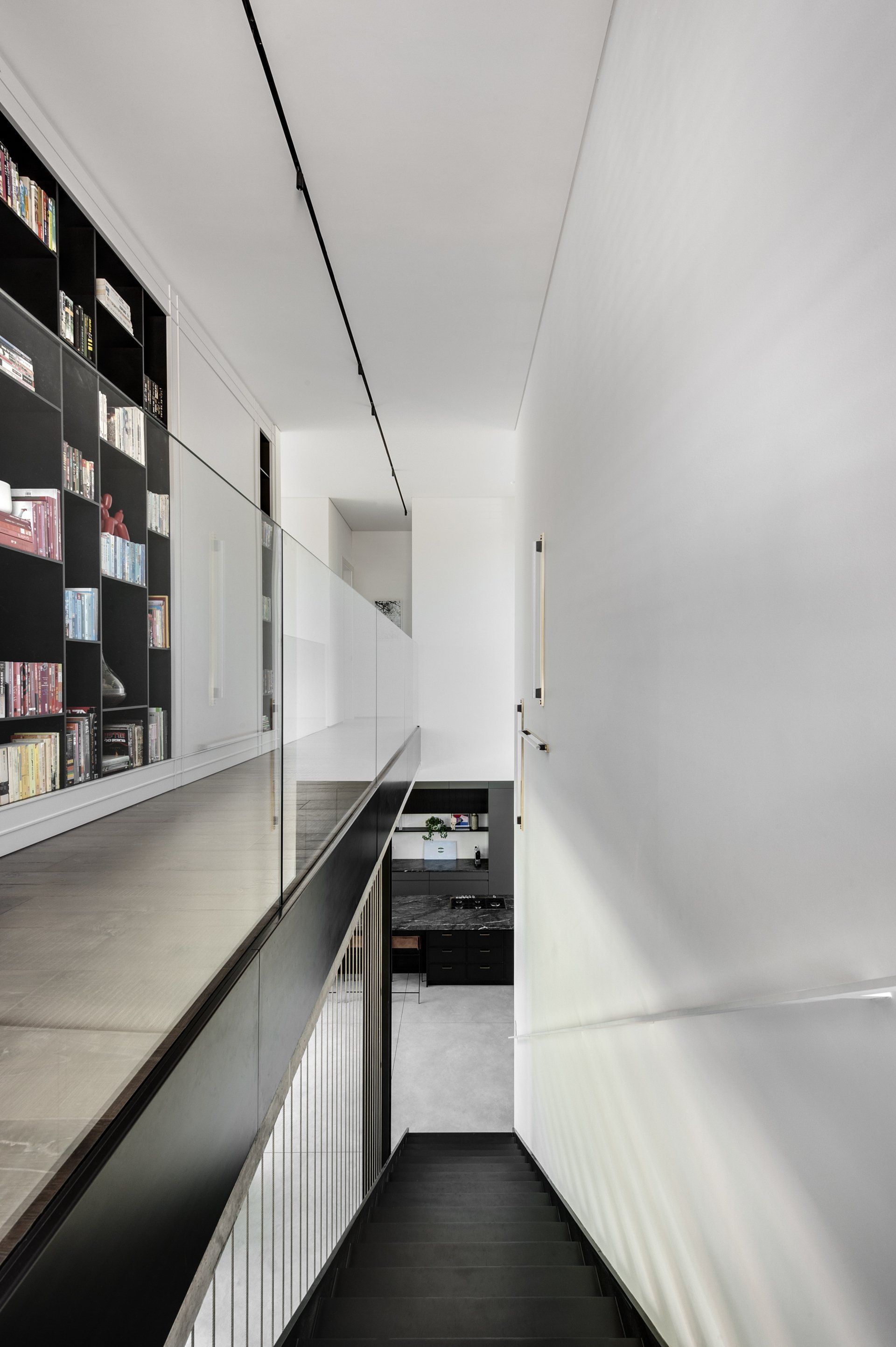 The bedrooms of the parents and children were designed on the first floor. The crossing between the rooms is accompanied by a bridge with a library and a glass railing, giving transparency and views to the lower space and the views of the neighborhood's vegetation and sky.