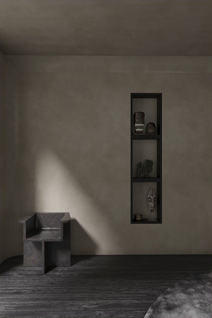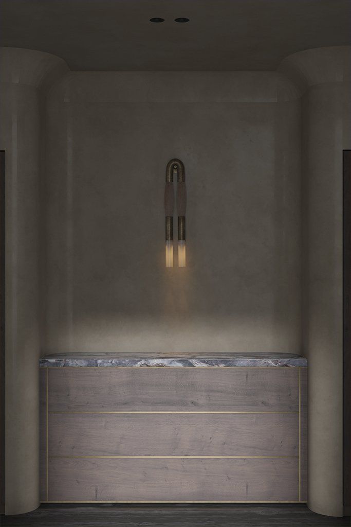 The “Brutus Chair” Designed by Kristian Sofus Hansen & Tommy Hyldahl for 101 Copenhagen company cast in lightweight fiber concrete, which creates a unique surface texture and emphasizes the fine balance between soft architectural lines and organic curves. “Column Sconce” in oxidized oak designed by New York-based design studio Workstead.