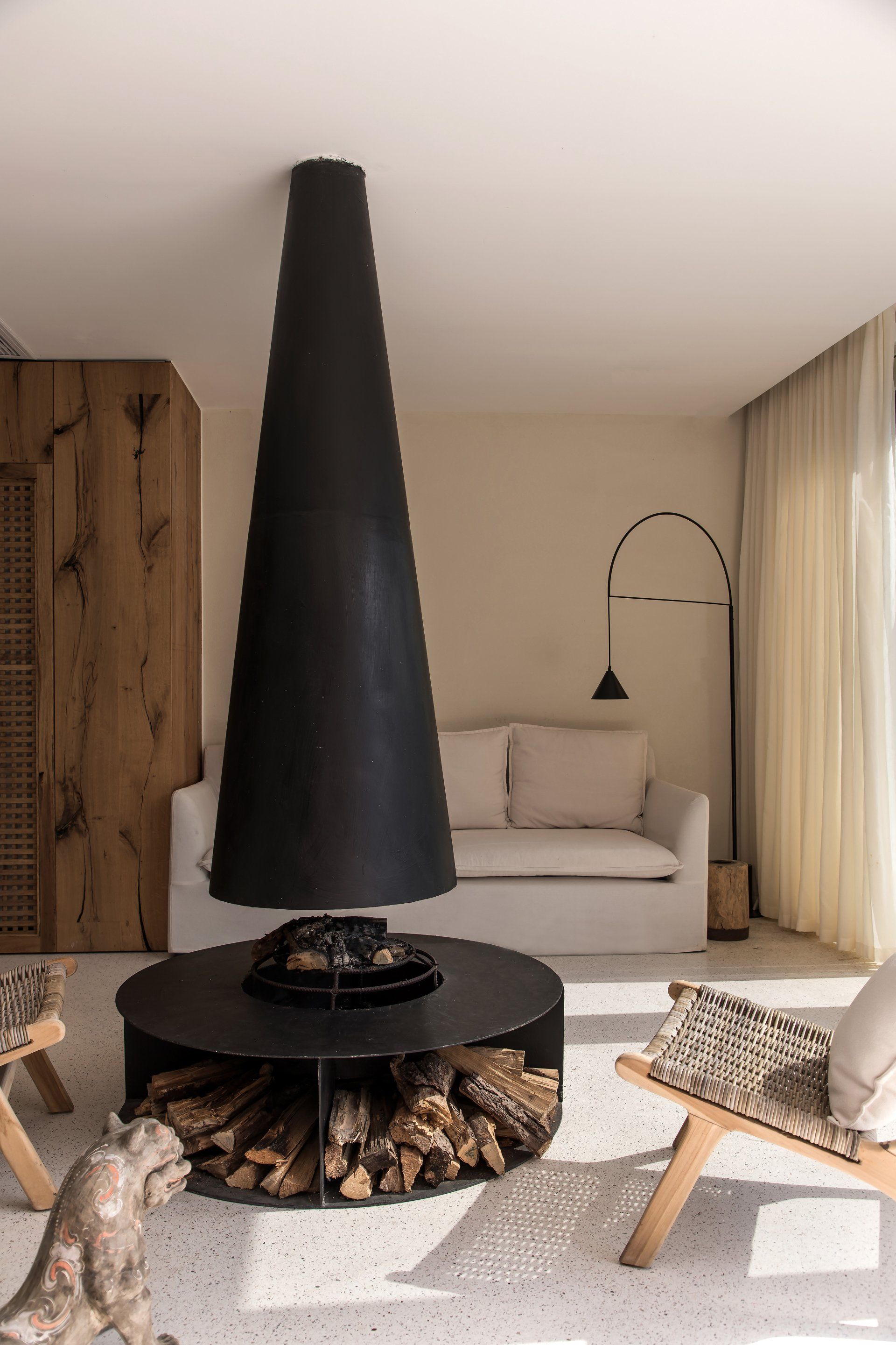 A large wooden bookcase and a black fireplace are displayed in front of the eyes, matching the natural beauty in the distance. Thanks to the whole house heating, the winter here is very comfortable, and you can enjoy the scenery without leaving home.